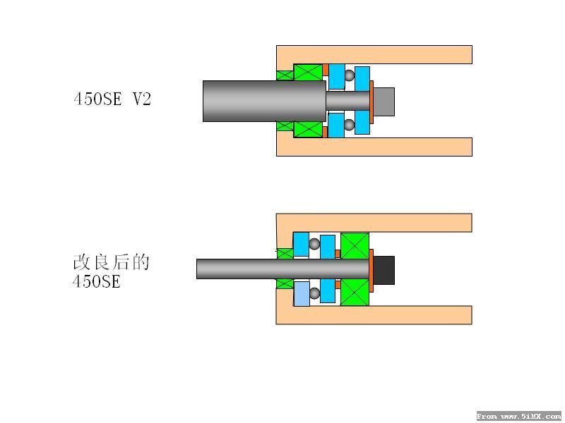SE V2桨夹只用了一个4X8X3的轴承.由于钢珠直径小承载能力不如3X8X4.